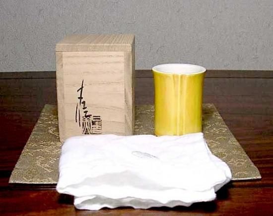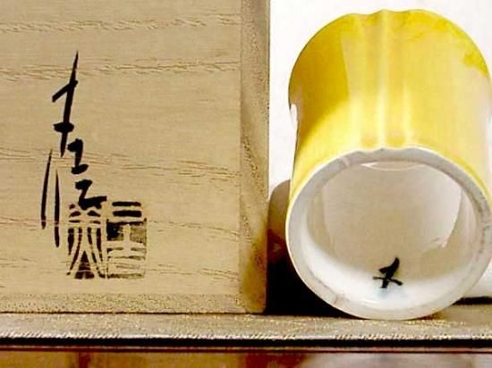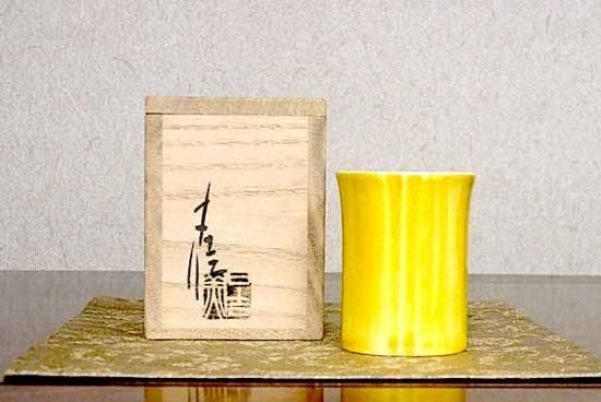 今日庵 日吉窯 加藤丈佳 作 黄釉 蓋置 共箱 無傷 保証。